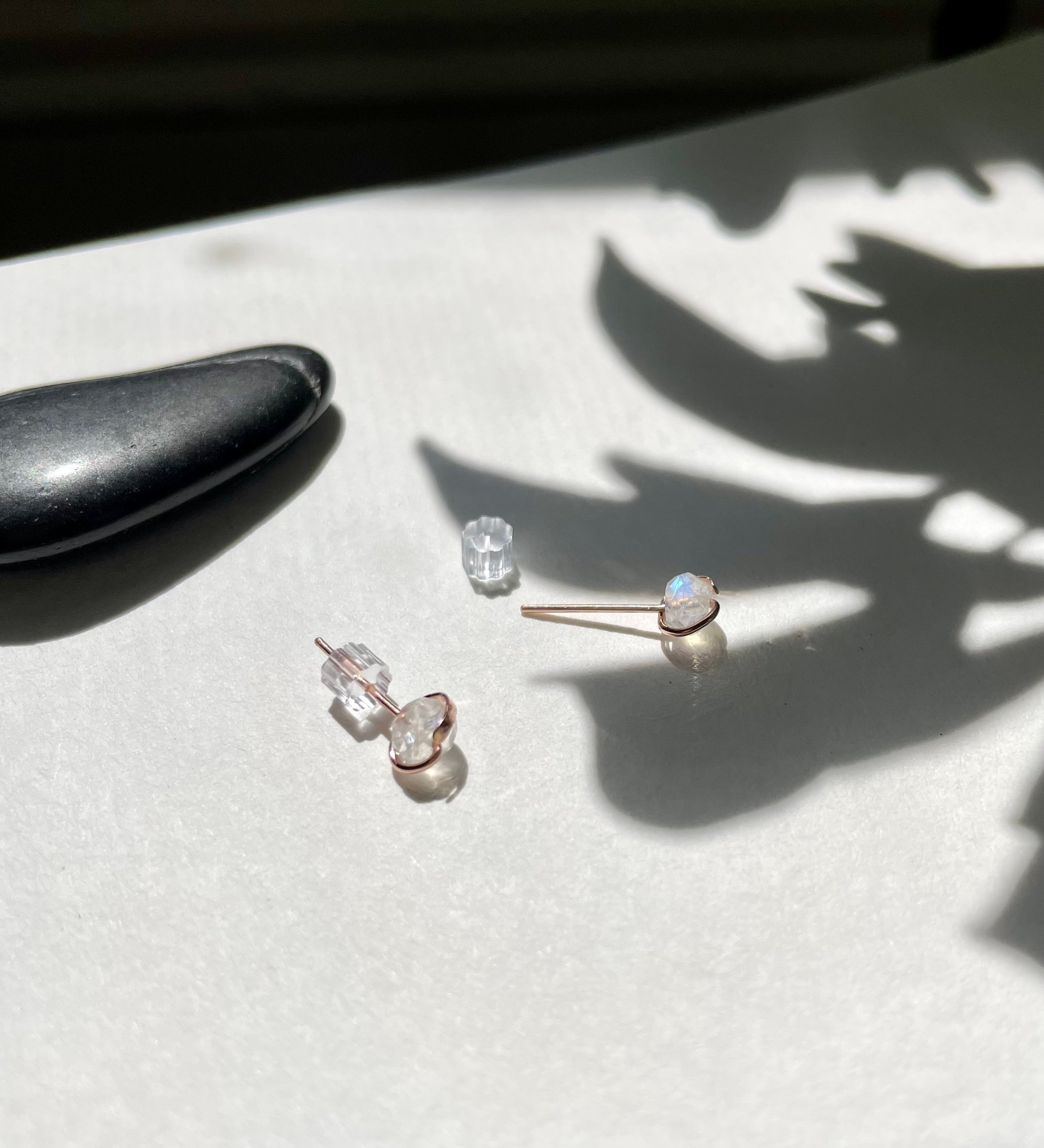 A minimalist approach to making a stud earrings. Made from a single wire that wraps around a 5mm rainbow moonstone instead of the traditional prongs. The result is a modern playful orb effect.